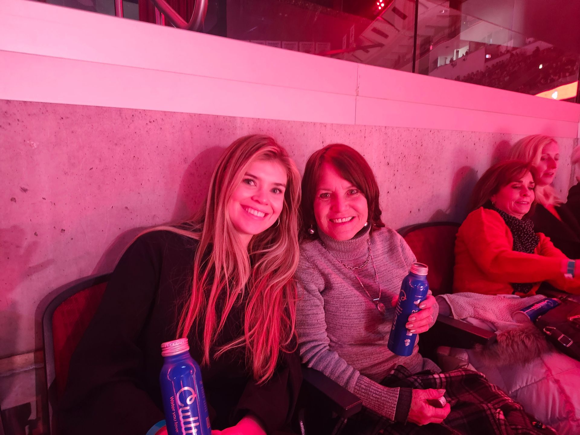 Three women are posing for a picture in front of a sign that says chicago blackhawks