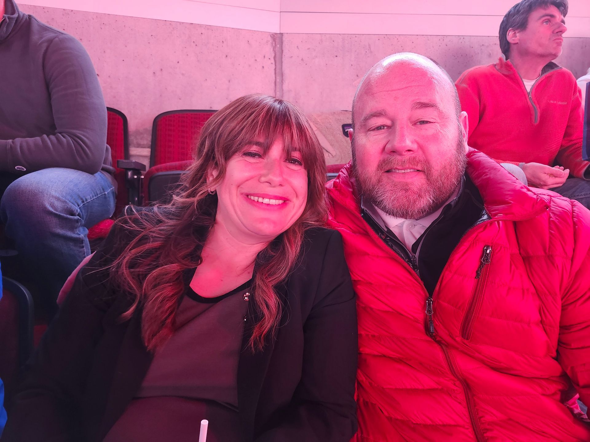 A man and a woman pose in front of a jersey that says bedard