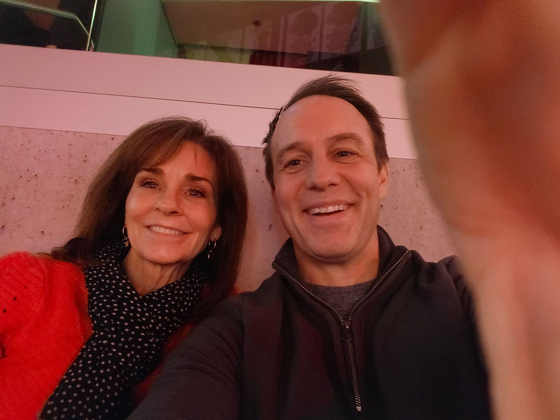 A man wearing glasses and a red hoodie smiles for the camera