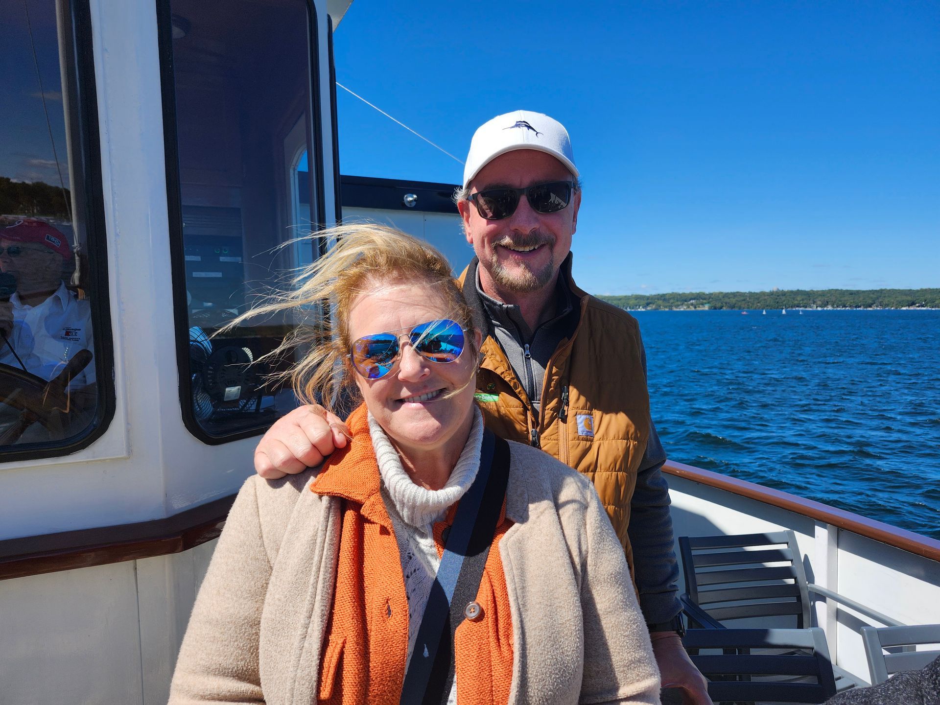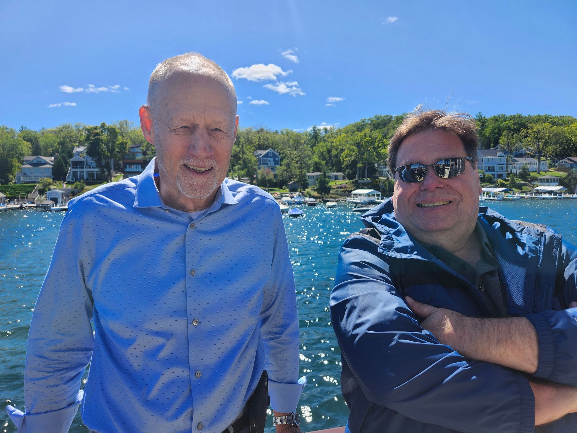 Two men standing on a boat with a city skyline in the background