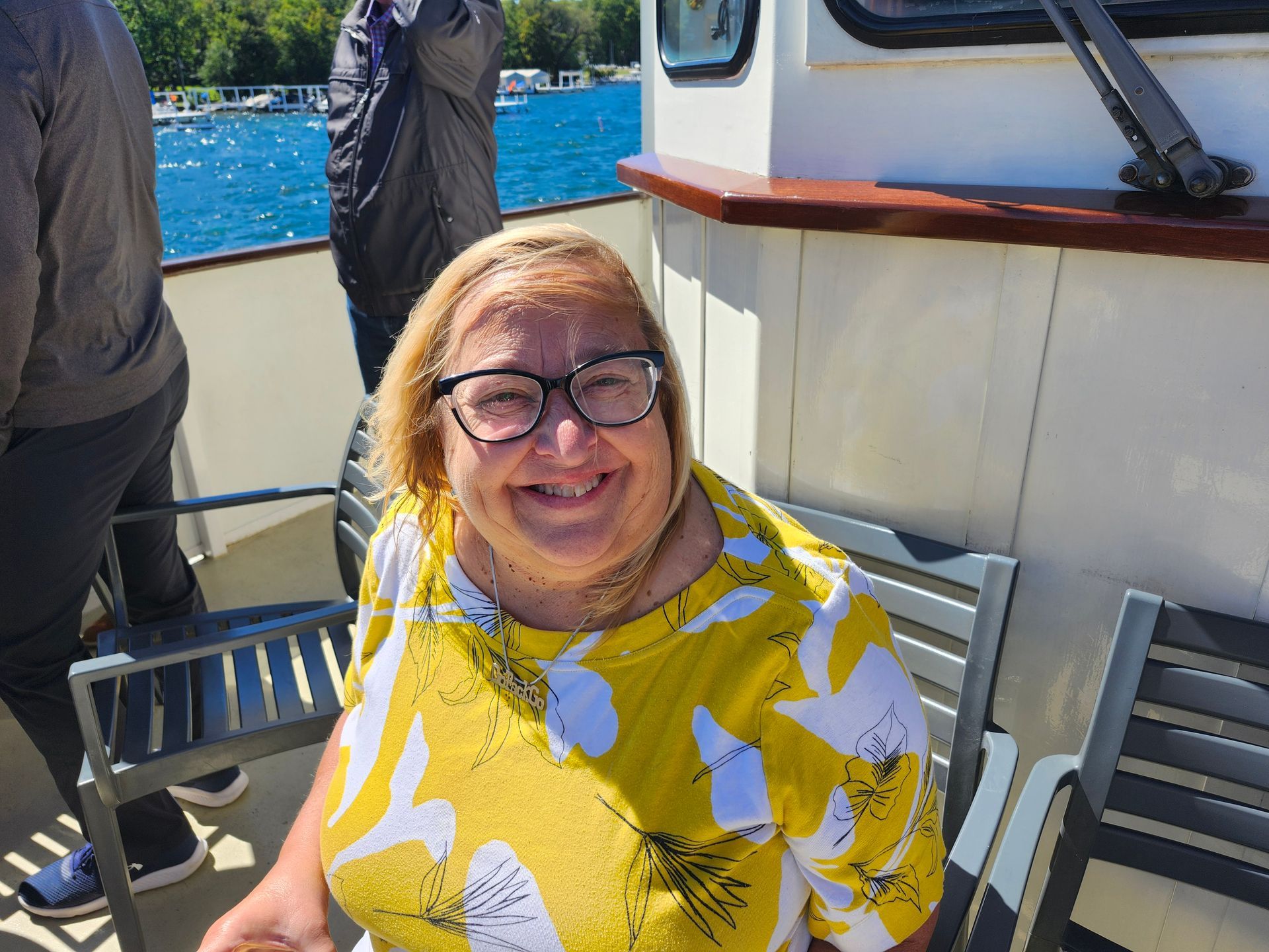 A woman stands in front of a river with a boat in the background