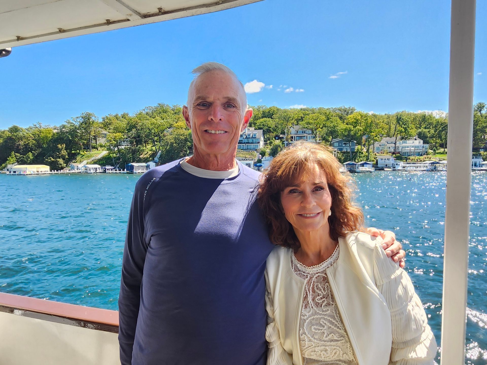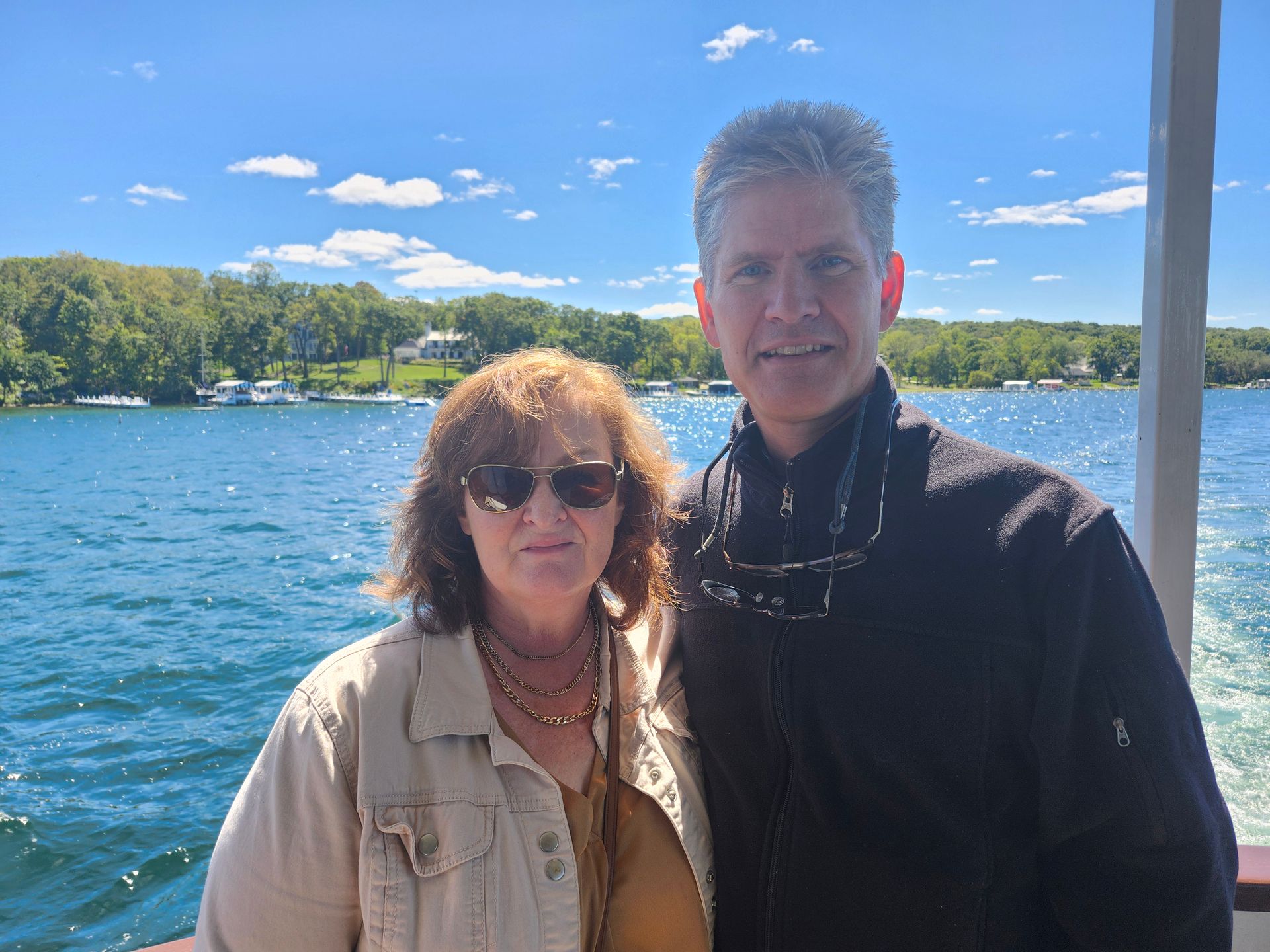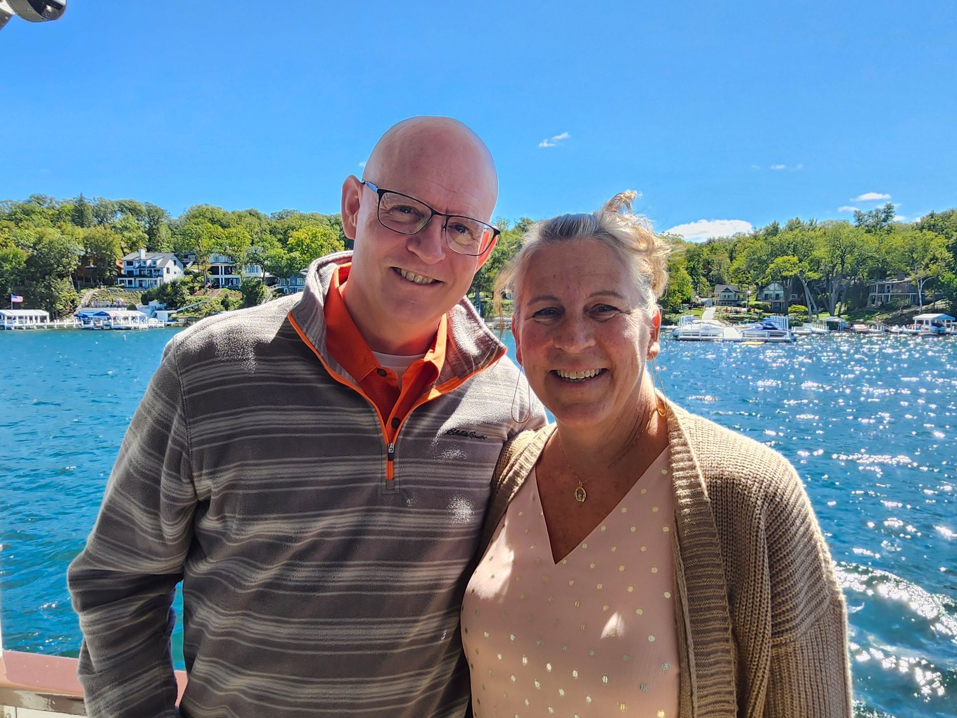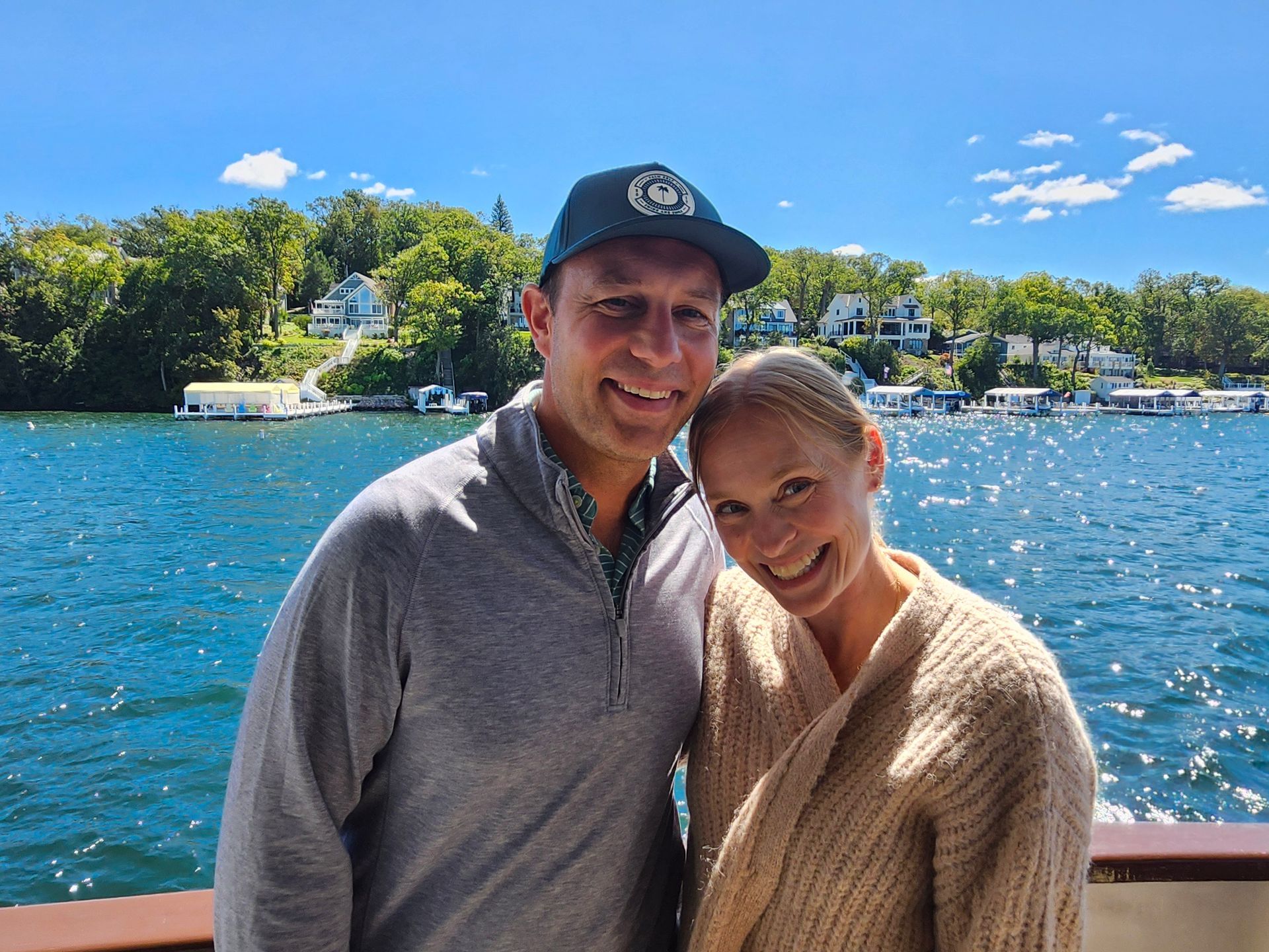 A man and a woman are standing in front of a body of water